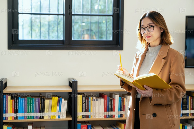 Молодая азиатская женщина читает книгу и делает заметки в учебной библиотеке