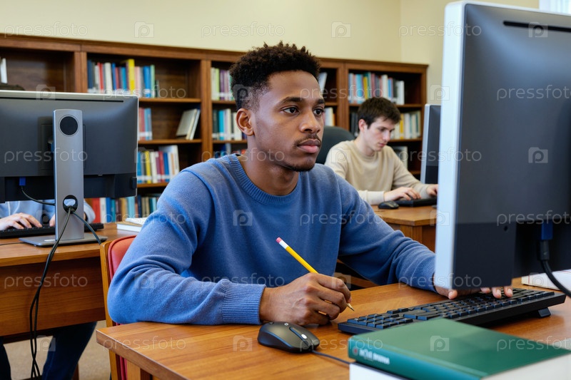 Молодой чернокожий мужчина учится на компьютере в библиотеке Классная среда