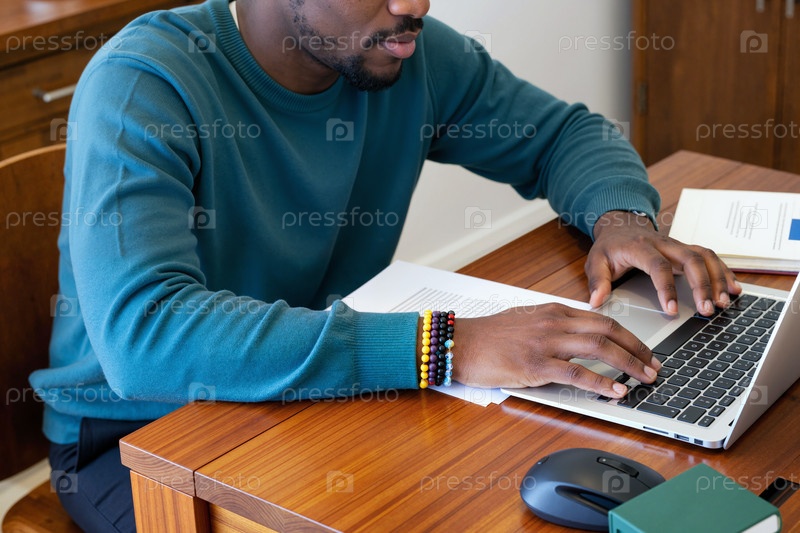 Молодой чернокожий мужчина учится за рабочим столом, используя ноутбук для исследований