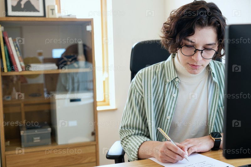 Молодой человек учится за рабочим столом и пишет записки в современной кабинете
