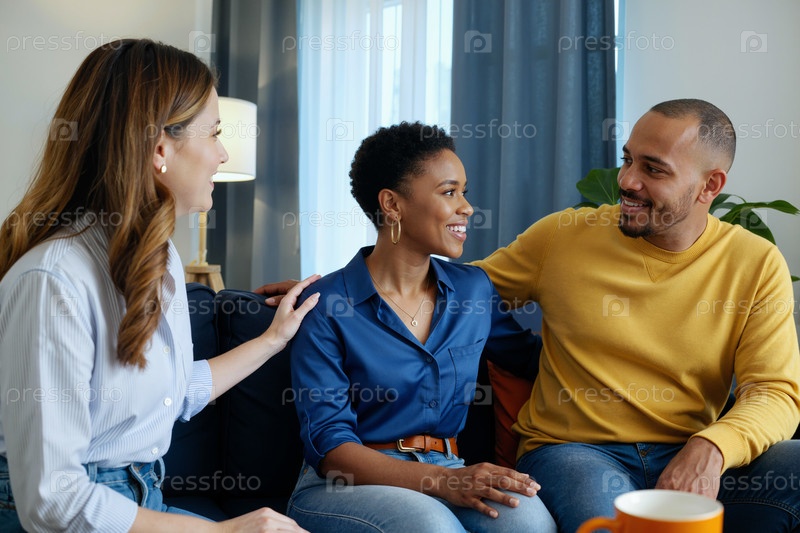 Молодые мультиэтнические взрослые улыбаются и разговаривают, сидя вместе в помещении