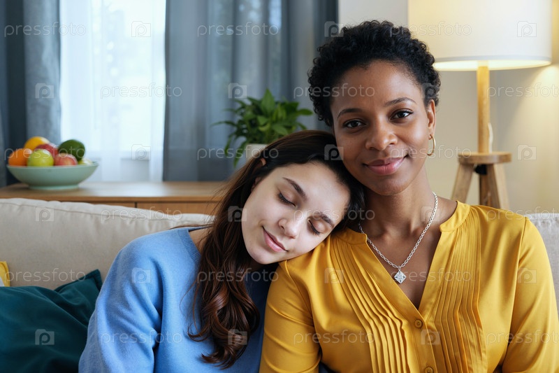 Портрет молодой женщины, отдыхающей головой на юной чернокожей женщине с улыбкой