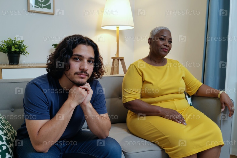 Молодой человек и старшая чернокожая женщина сидят на диване, глядя вдумчиво