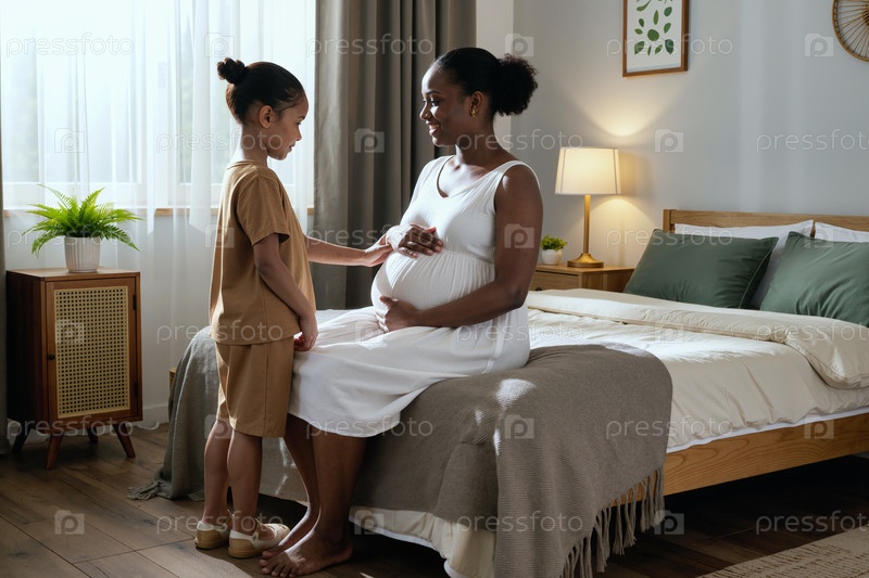 Беременная чернокожая женщина улыбается молодой чёрной девушке, стоящей у кровати
