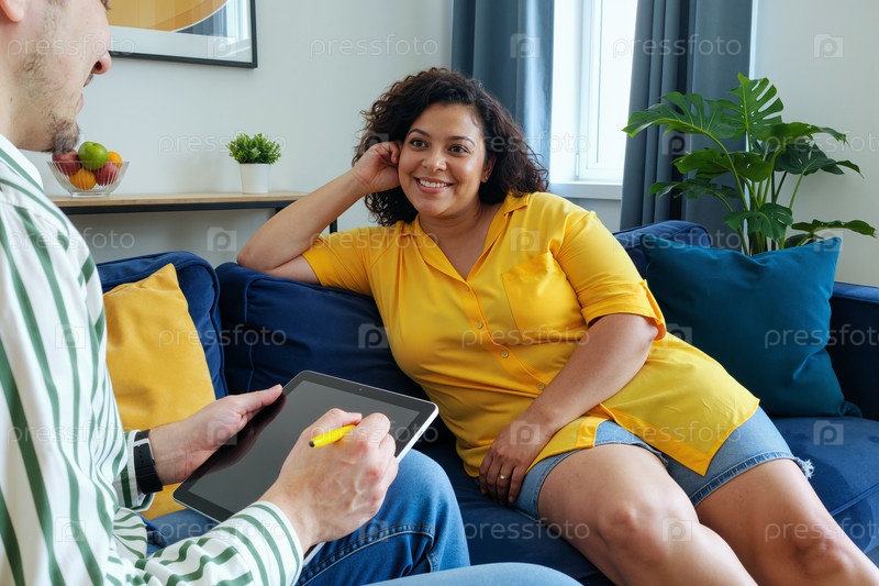 Молодая женщина улыбается, разговаривая с мужским терапевтом в помещении