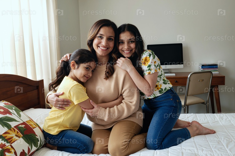 Мать обнимает двух дочерей, улыбаясь вместе на кровати в помещении