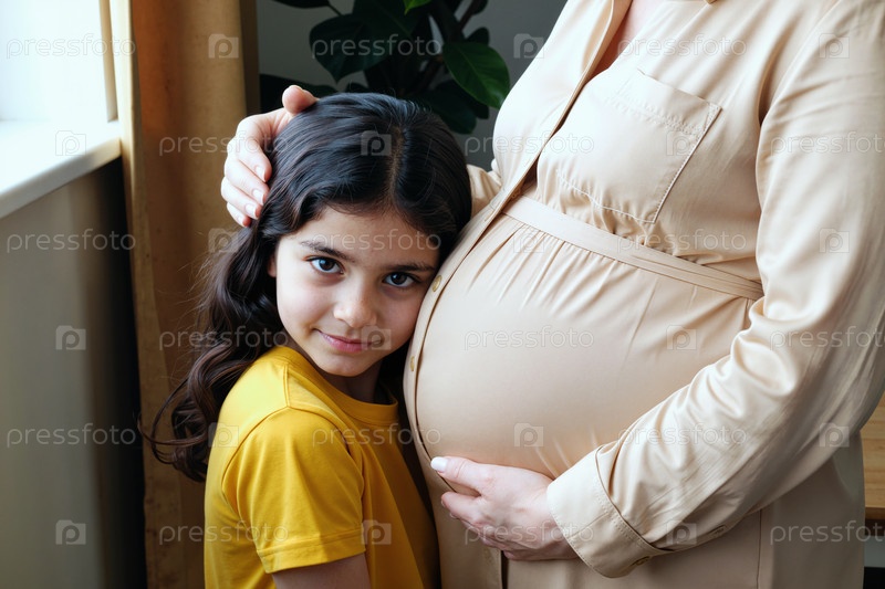 Испанская девушка обнимает беременную женщину в помещении молодой улыбается