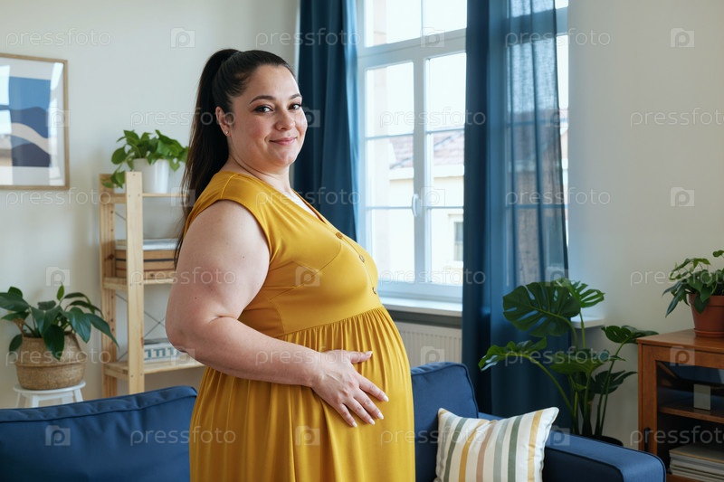 Портрет молодой женщины, улыбающейся во время прикосновения к беременному животу