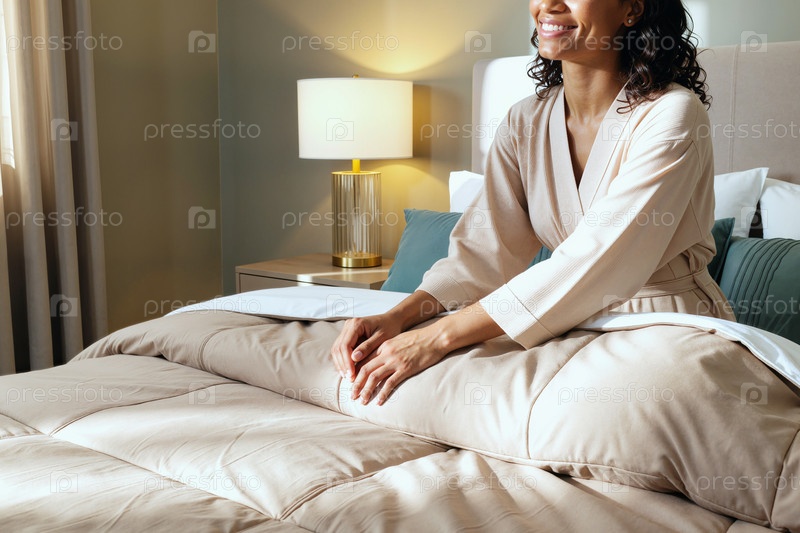 Молодая чернокожая женщина улыбается, сидя на кровати в современной спальне