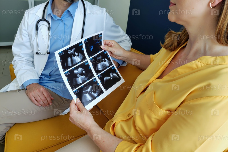 Взрослая женщина консультируется с мужским врачом во время обзора УЗИ