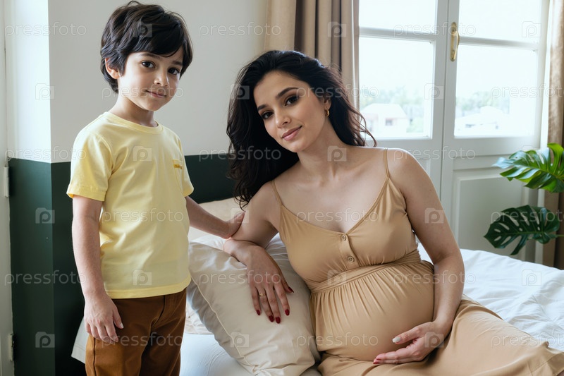 Беременная молодая женщина сидит на кровати с юным мальчиком, улыбающимся