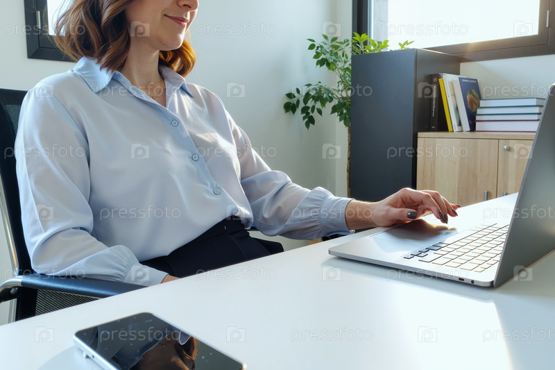 Молодая взрослая женщина работает на ноутбуке в современной офисной среде