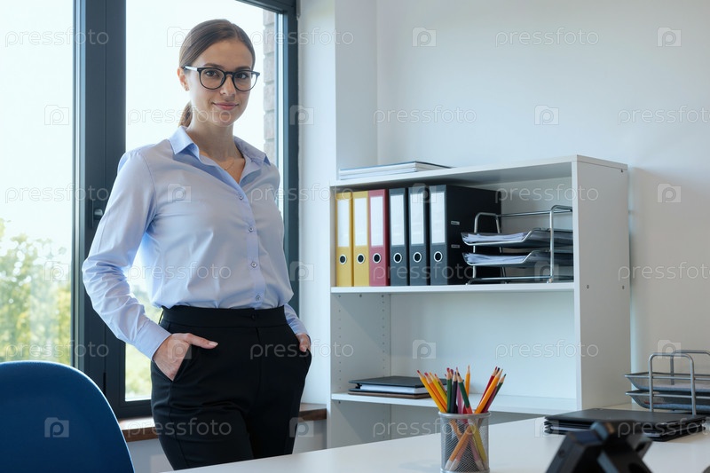 Портрет молодой взрослой женщины, уверенно стоящей в офисе