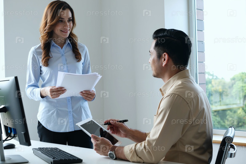 Молодая женщина передает документы молодому латиноамериканскому мужчине, использующему цифровой планшет