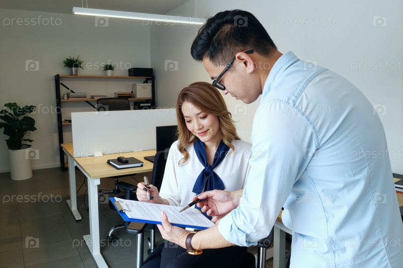Молодой азиатский мужчина объясняет документ молодой азиатской женщине в современном офисе