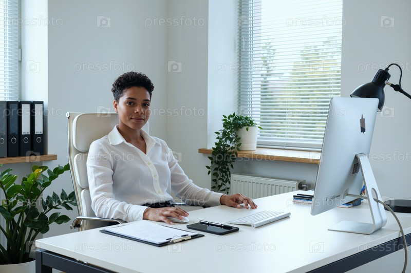 Портрет молодой взрослой чернокожей женщины, сидящей за рабочим столом и работающей в офисе