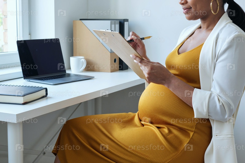 Беременная молодая взрослая чернокожая женщина пишет записки, сидя за рабочим столом