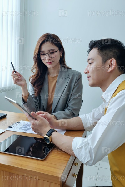 Молодой азиатский мужчина и женщина сотрудничают над цифровым планшетом в офисной обстановке