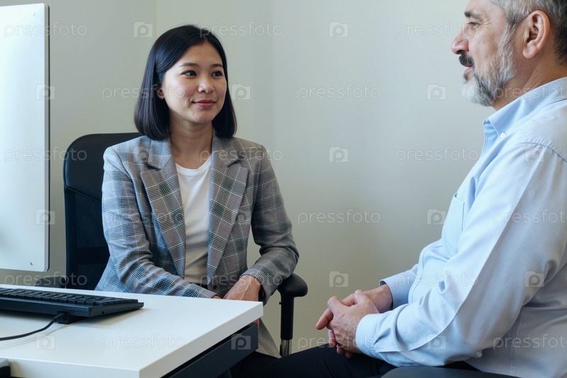 Молодая взрослая азиатская женщина слушает мужчину среднего возраста в офисе