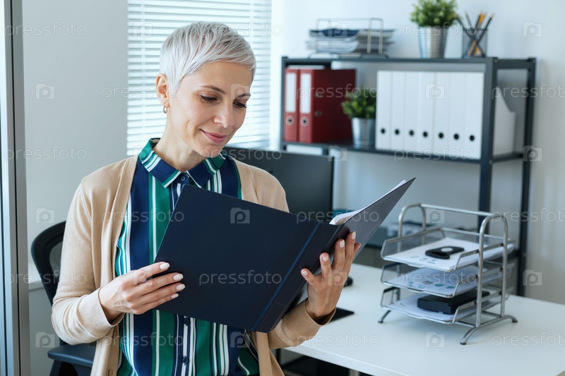 Женщина среднего возраста читает документы в современном офисном рабочем пространстве