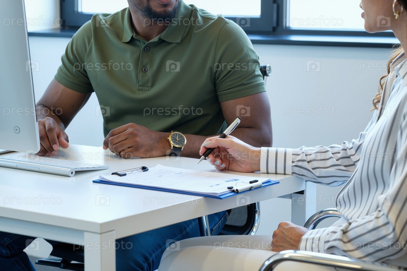 Молодая женщина и молодой чернокожий мужчина обсуждают документы за столом