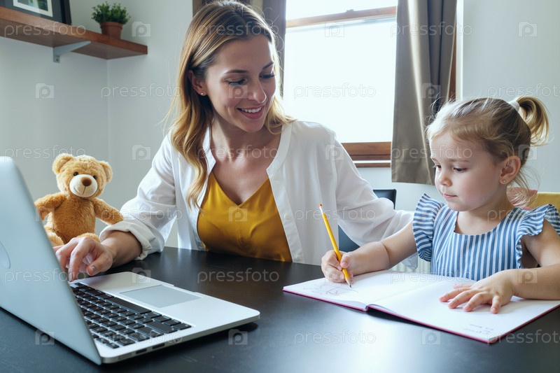 Молодая взрослая женщина работает удаленно, помогая ребенку с домашними заданиями