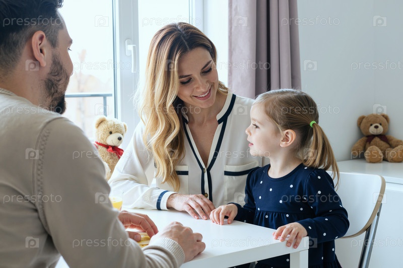 Молодая взрослая женщина и мужчина взаимодействуют с ребенком в помещении
