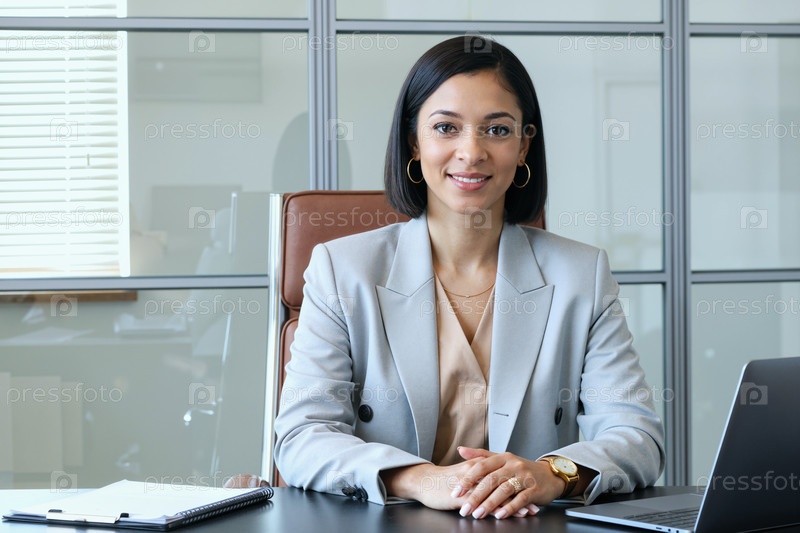 Портрет молодой взрослой женщины, улыбающейся, сидящей за столом в офисе