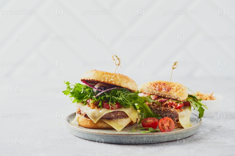 Два гамбургера с телячьим котлетом и травами на деревянной доске