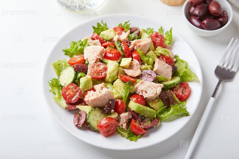 Салат с тунцом, салатами, огурцами, помидорами, маслинами и авокадо в белой тарелке на столе