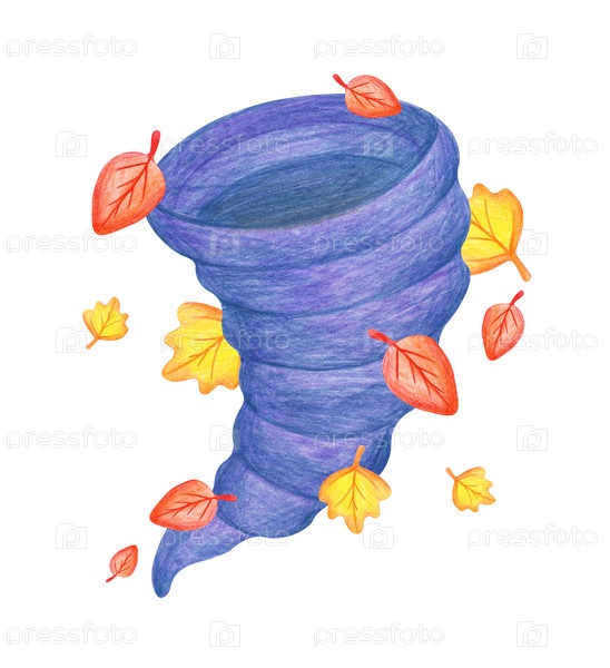 Стилизованный вихрь, вращающийся вокруг ярких осенних листьев, нарисованный вручную. Синий торнадо рисуется цветными карандашами. Рисунок изолирован карандашом на белом фоне. Природные катаклизмы. Клипарт