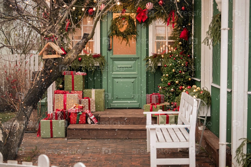 Украшенный к Рождеству фасад дома с дверью, подарками, венком из вечнозеленых растений и праздничными огнями, падающий снег для праздничного зимнего сезона