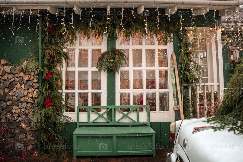 Декорированный вход в дом с зеленой скамейкой перед большим окном, украшенным праздничными рождественскими гирляндами и огнями
