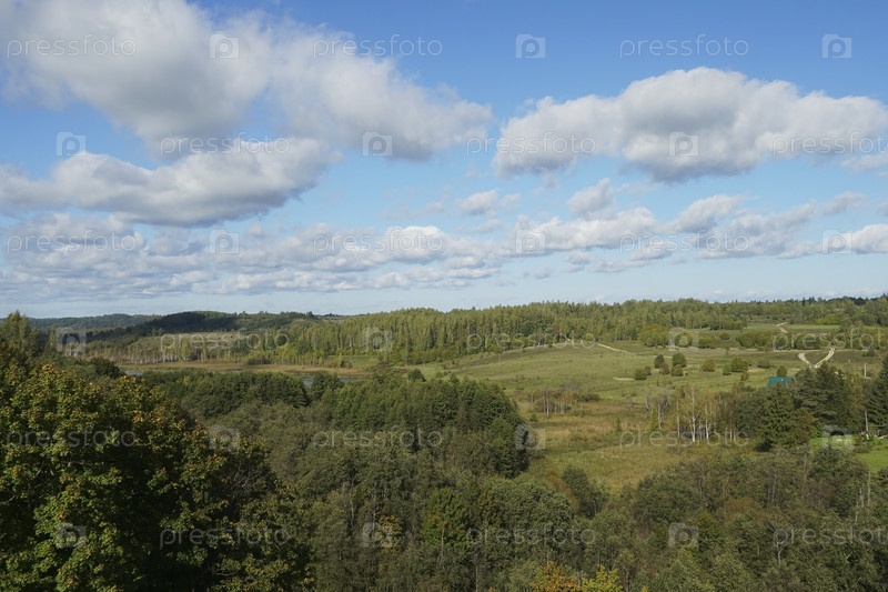Леса, холмы и рощи под голубым небом с красивыми облаками в солнечный летний день