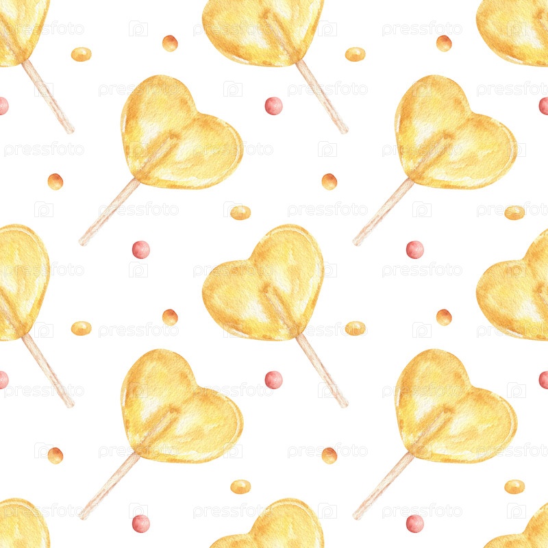 Конфеты, изготовленные в стиле акварели, с бесшовным узором желтых сладостей в форме сердец на День святого Валентина