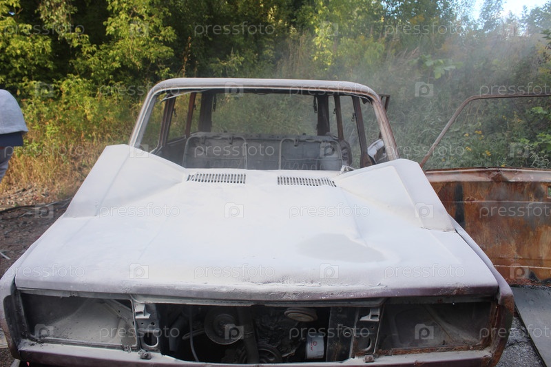 Машина покрыта пером от огнетушителя.Последствия тушения пожара