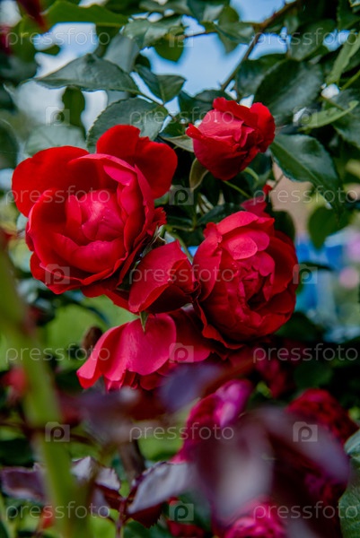 Роза, цветущая красным цветком в саду среди зеленых листьев