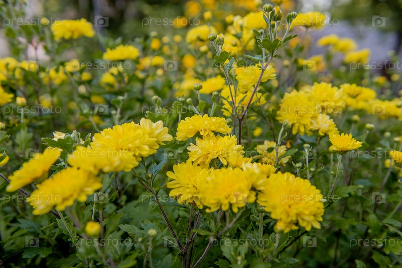 Цветут желтые цветы, хризантемы в саду с зеленой лиственницей