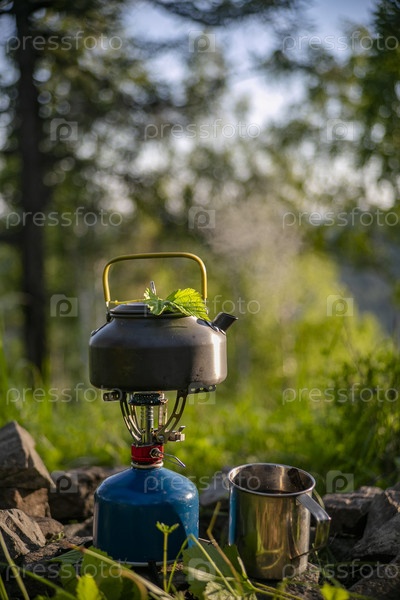 Летний натюрморт, кипящий чайник на газовом горелке и кружка с горячим чаем на фоне леса