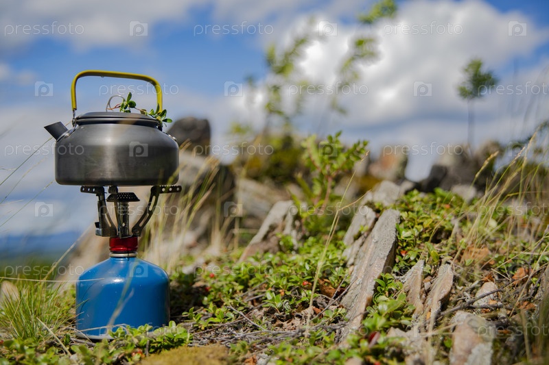 Летний натюрморт, кипящий чайник на газовом горелке и кружка с горячим чаем на фоне камней и облачного неба
