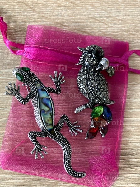 Две броши на розовом мешке
