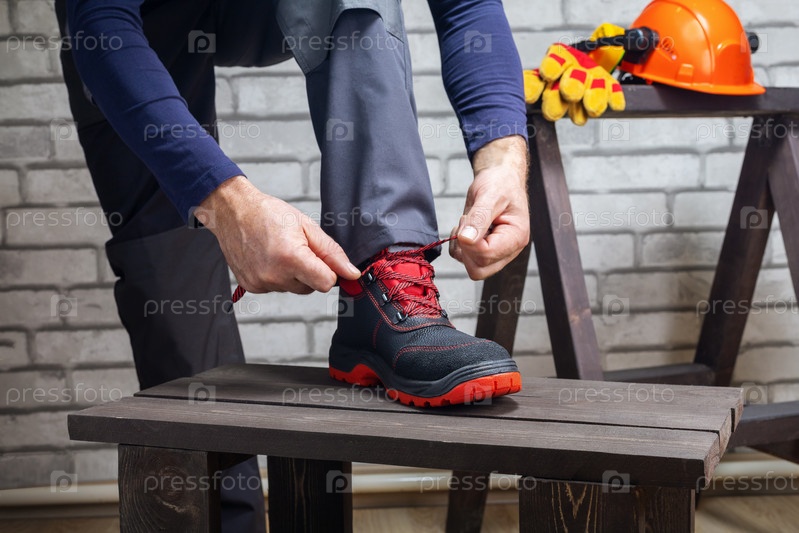 Работник надевает обувь для работы