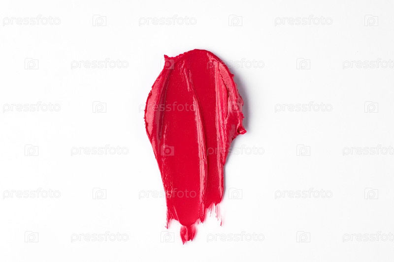 Красная помада. Red lipstick swatch smudged texture isolated on white with copy space for background. Beauty concept