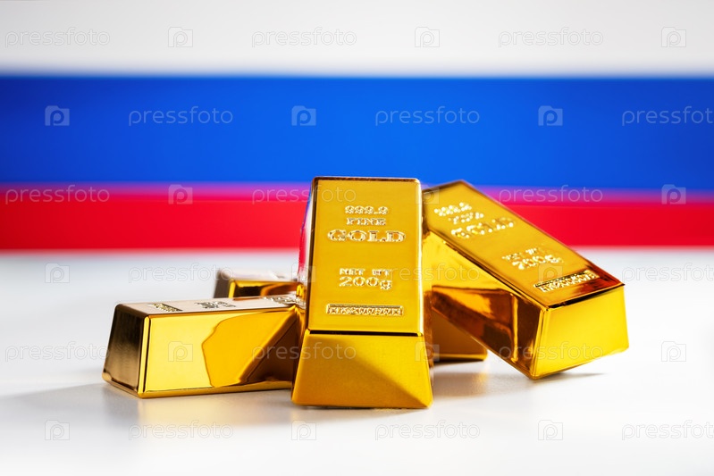 Золотые слитки на фоне российского флага.Концепция золотых резервов России