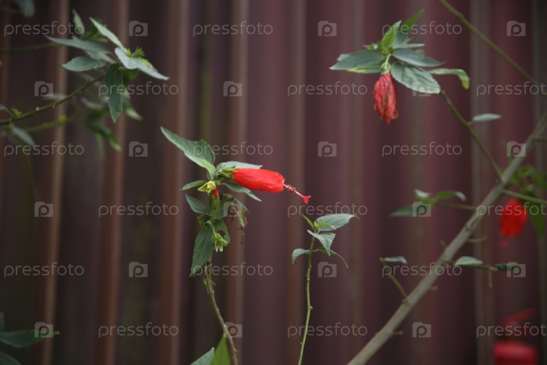 Цветы красного экзотического цвета в саду, деревянного мальвависка (Malvaviscus arboreus), также известный как 'спающий гибискус' или 'турецкая шляпа';