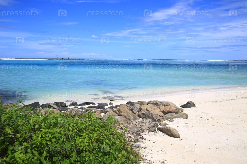 Пляж, пальмы и голубое небо на тропическом курорте в океане