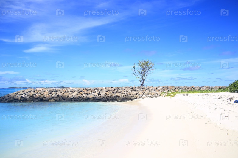 Пляж и голубое небо на тропическом курорте в океане