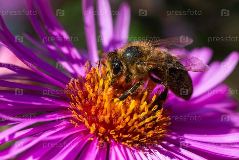 Медоносная пчела опыляет яркий цветок Astra