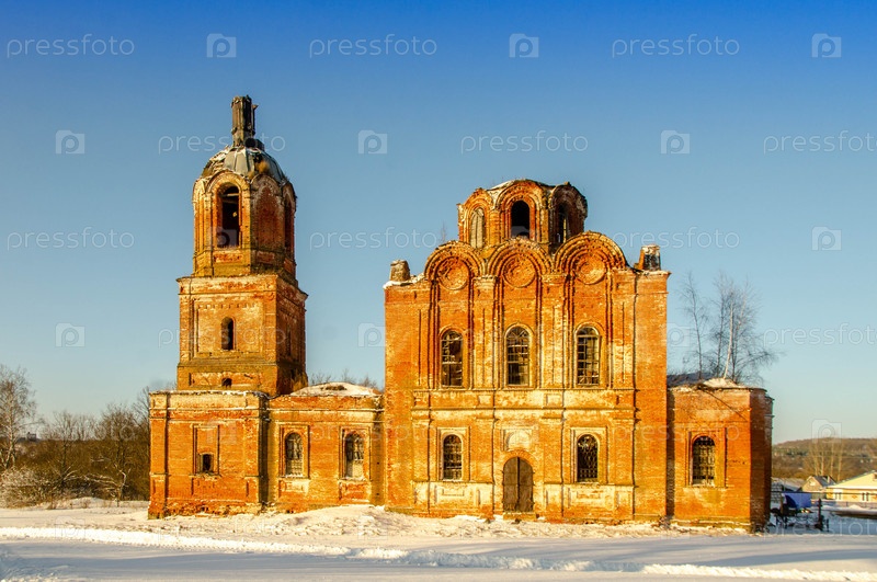 Заброшенная кирпичная церковь с колокольницей, стоящая на снежном поле под чистым голубым небом
