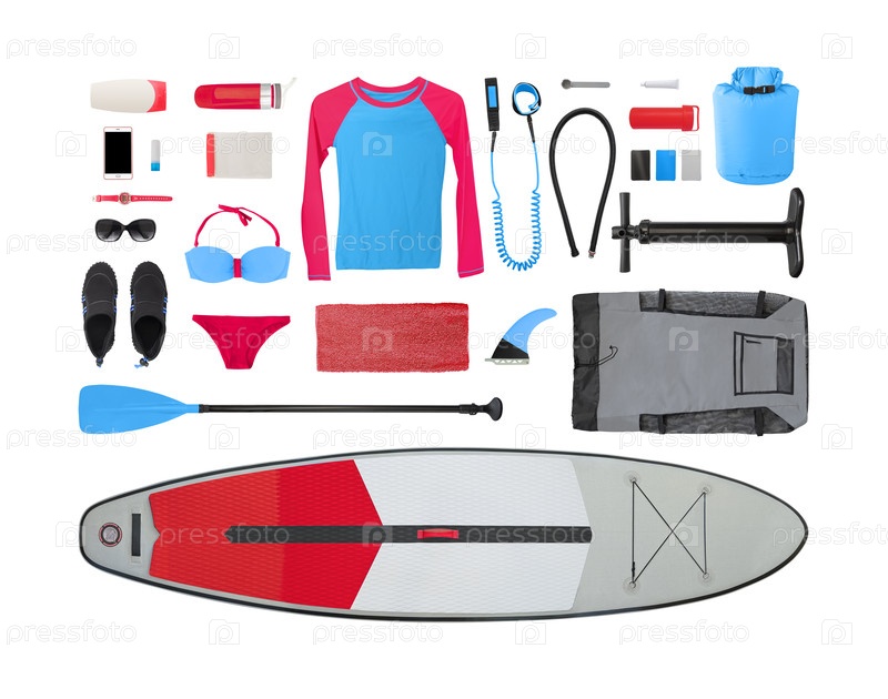 Flat laying paddle board, купальная одежда и аксессуары для женщин изолированы на белом